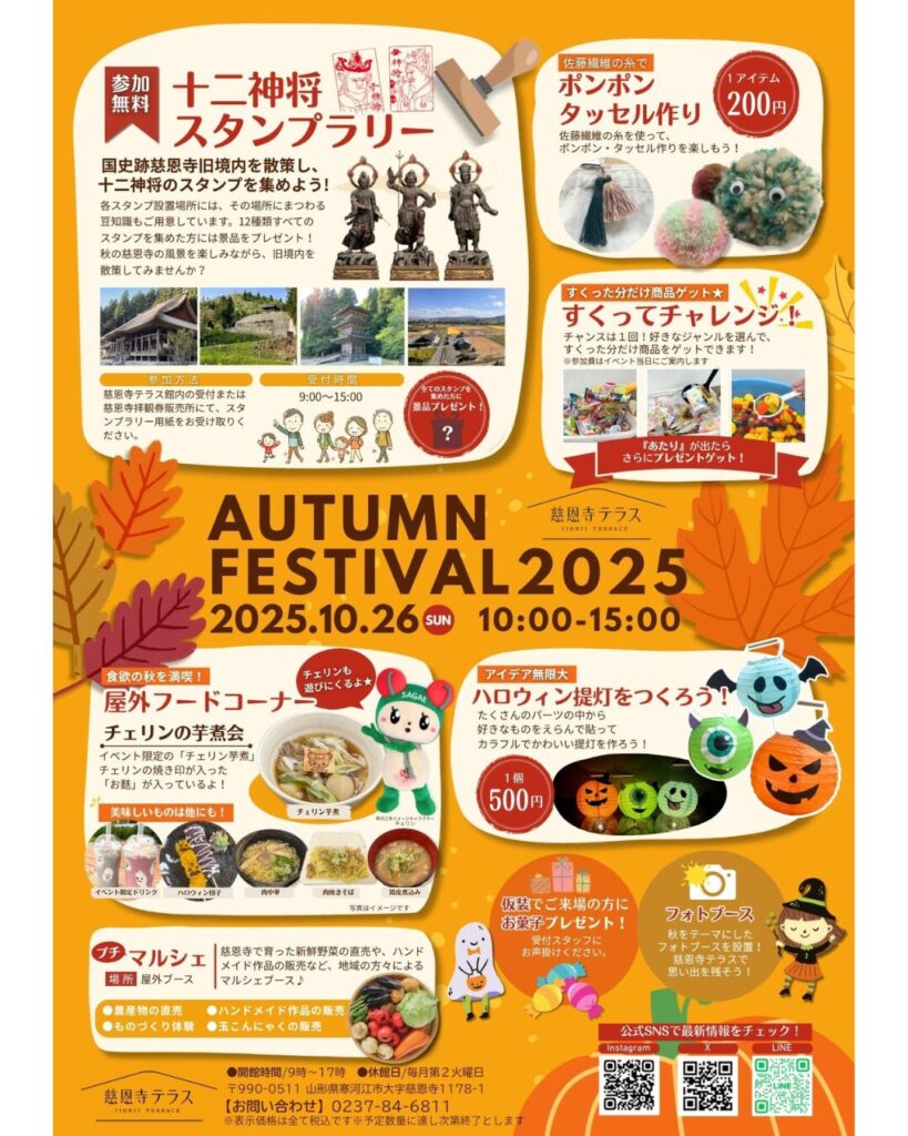 10月 26日(日) 慈恩寺テラス「 AUTUMN FESTIVAL 2025 」 実りの秋、行楽の秋がやってきました!寒河江市の慈恩寺テラスでは、秋の魅力を満喫できる「AUTUMN FESTIVAL 2025」が、10/26(日)に開催されます。国史跡・慈恩寺の境内を巡るスタンプラリー(無料)や、山形の秋の味覚「芋煮」、ハロウィンにちなんだワークショップなど、子どもから大人まで楽しめるイベントが盛りだくさんです。ご家族やご友人などで、慈恩寺の美しい秋の一日を過ごしませんか?◆開催日:2025年 10月 26日(日) 10:00~15:00◆場 所:慈恩寺テラス◆問い合わせ:慈恩寺テラス TEL0237-84-6811 2025年10月09日更新