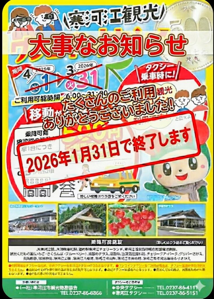 寒河江観光「ワンコインタクシー」 寒河江市の旅が便利でお得になる 特別キャンペーン! 寒河江市内の主要な観光施設から駅、温泉宿まで、指定された施設間の移動が タクシー1台なんと500円で利用できる 寒河江観光 […]