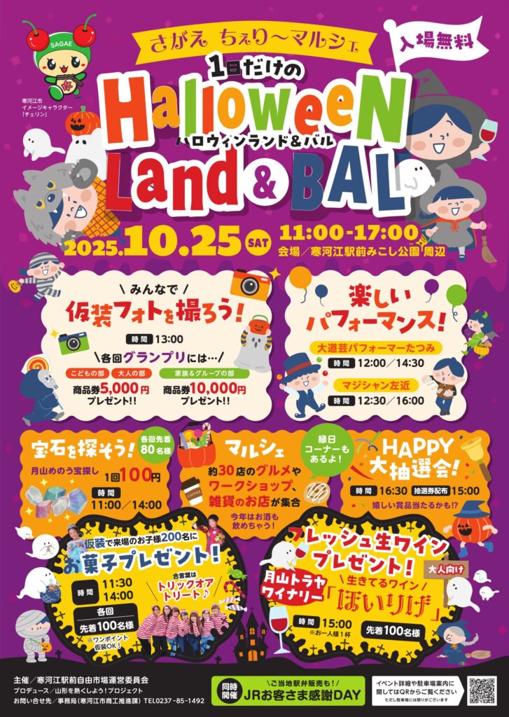 10月25日(土) さがえ ちぇり~マルシェ㏠だけの Halloween Land&BAL さがえ ちぇり~マルシェ「 1日だけのHalloween Land&BAL 」寒河江駅前がハロウィン一色に染まる!グルメやパフォーマンス、豪華賞品が当たるコンテストまで、子どもから大人まで一日楽しめるスペシャルイベントが開催されます。ご家族、ご友人と一緒に最高のハロウィンを過ごしませんか? ※詳細は↓をクリックしてください。 さがえちぇり~マルシェ2025:寒河江市公式サイト ◆開催日:2025年 10月25日(土) 11:00~17:00 ◆場 所:寒河江駅前みこし公園 周辺 ◆問い合わせ:寒河江市商工推進課 TEL0237-85-1492 2025年10月07日更新