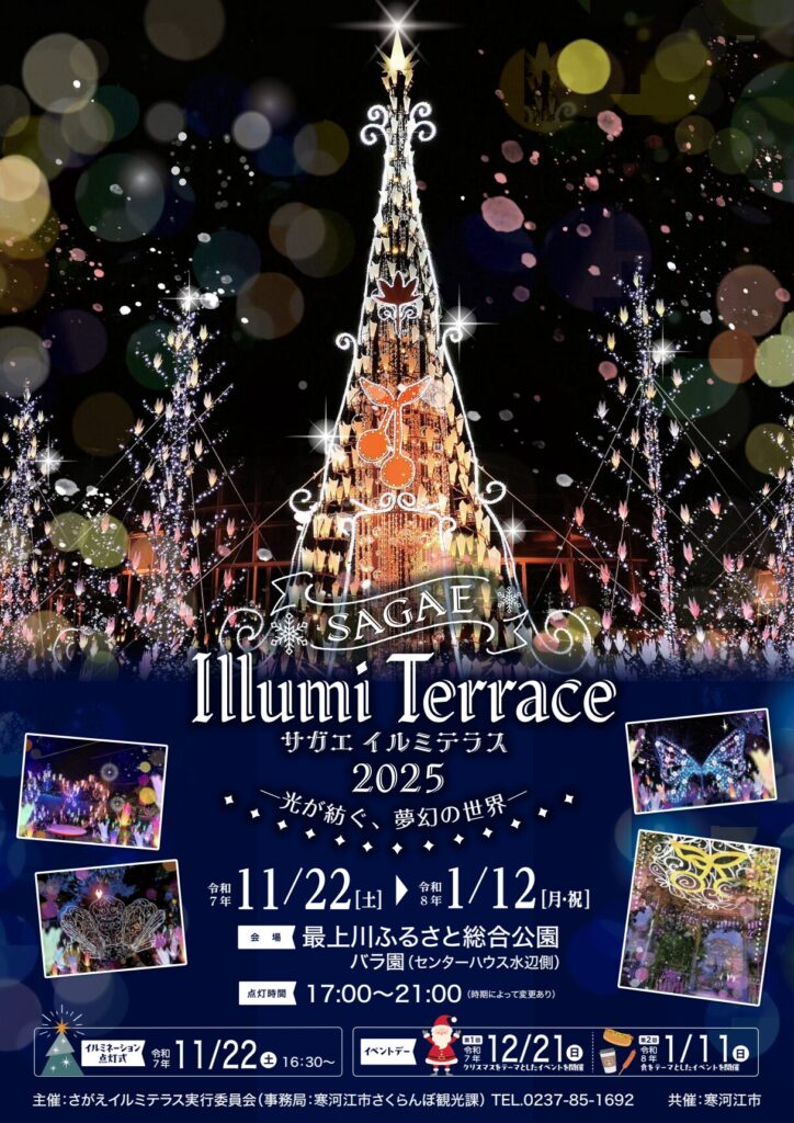 2025. 11/22(土)~2026. 1/12(月祝) 「さがえイルミテラス」 今年初開催の「さがえイルミテラス2025」 音楽と光が織りなす幻想的な”光の庭園”が寒河江の冬を彩ります。 2025年冬、寒河江市で新たに「さがえイルミテラス」が始まります。このイベントは、冬期間の観光を盛り上げ、街に賑わいを創出することを目的としています。最上川ふるさと総合公園を舞台に、音楽とシンクロして変化するイルミネーションが、訪れる人々を幻想的な世界へと誘います。冬花火やグルメイベントも満載で、家族、カップル、友人と、誰もが楽しめる光の祭典です。 ◆開催期間:2025年 11月22日(土)~2026年 1月12日(月祝) ◆会 場:最上川ふるさと総合公園 バラ園(センターハウス水辺側) ◆点灯時間:17:00 ~ 21:00 (※時期により変動あり) ◆入 場 料:無料 ◆お問合せ:さがえイルミテラス実行委員会事務局(寒河江市さくらんぼ観光 2025年10月19日更新
