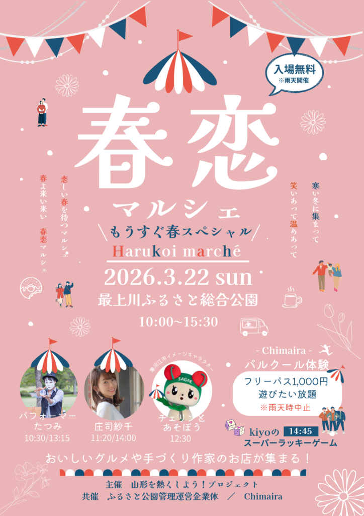 ホーム〉2026年3月22日 春恋マルシェ 開催 春恋マルシェ~もうすぐ春スペシャル~開催 山形県寒河江市にて、心もお腹も満たされる「春恋マルシェ 〜もうすぐ春スペシャル〜」が開催されます。詳細は以下の通りです。開催日: 2026年3月22日(日)時間: 10:00 〜 15:30会場: 最上川ふるさと総合公園入場料: 無料(※雨天開催) 3月22日は、ぜひ「最上川ふるさと総合公園」へ足を運んでみてくださいね! 2026年02月24日更新