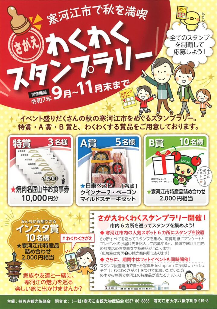 9月~11月末まで「わくわくスタンプラリー」 秋の寒河江市を巡りながら豪華賞品があたるチャンス! 寒河江市内に設置された6カ所のスタンプを全て押して道の駅寒河江の総合観光案内所の応募箱に投函してください。さらに、スタン