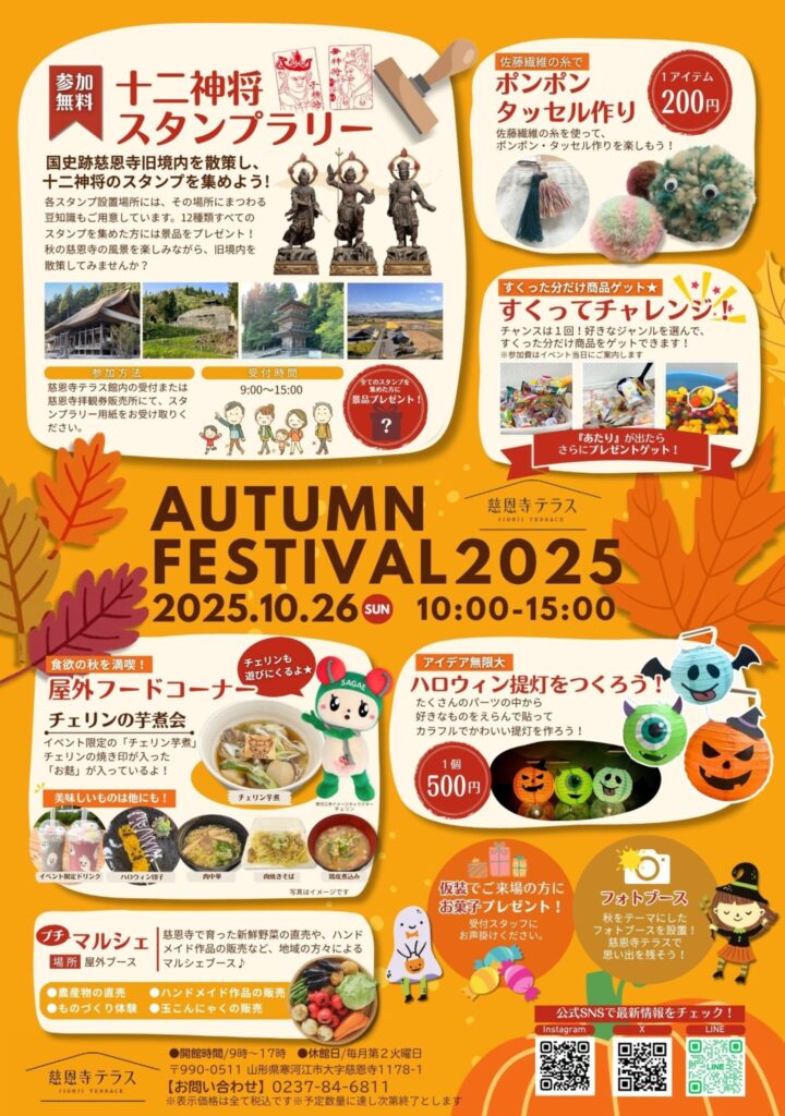 10月 26日(日) 慈恩寺テラス「 AUTUMN FESTIVAL 2025 」 実りの秋、行楽の秋がやってきました!寒河江市の慈恩寺テラスでは、秋の魅力を満喫できる「AUTUMN FESTIVAL 2025」が、10/26(日)に開催されます。国史跡・慈恩寺の境内を巡るスタンプラリー(無料)や、山形の秋の味覚「芋煮」、ハロウィンにちなんだワークショップなど、子どもから大人まで楽しめるイベントが盛りだくさんです。ご家族やご友人などで、慈恩寺の美しい秋の一日を過ごしませんか? ◆開催日:2025年 10月 26日(日) 10:00~15:00 ◆場 所:慈恩寺テラス ◆問い合わせ:慈恩寺テラス TEL0237-84-6811 2025年10月09日更新