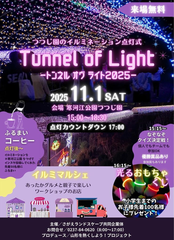 11月 1日(土) トンネル オヴ ライト 2025つつじ園のイルミネーション点灯式 寒河江市の夜空を彩る幻想的な光の祭典が、今年も寒河江公園つつじ園で行われます!11/1(土)には、イルミネーションイベント「Tunnel of Light 2025」の点灯式が開催され、美しい光のトンネルはもちろん、心も体も温まるグルメやワークショップ、お子様が喜ぶプレゼント企画など、家族みんなで楽しめるコンテンツが盛りだくさんです。 ◆開催日:2025年 11月 1日(土) 15:00~18:30(※点灯式カウントダウン 17:00) ◆場 所:寒河江公園つつじ園 ◆問い合わせ:(主催)さがえランドスケープ共同企業体 TEL0237-84-0620 2025年10月09日更新