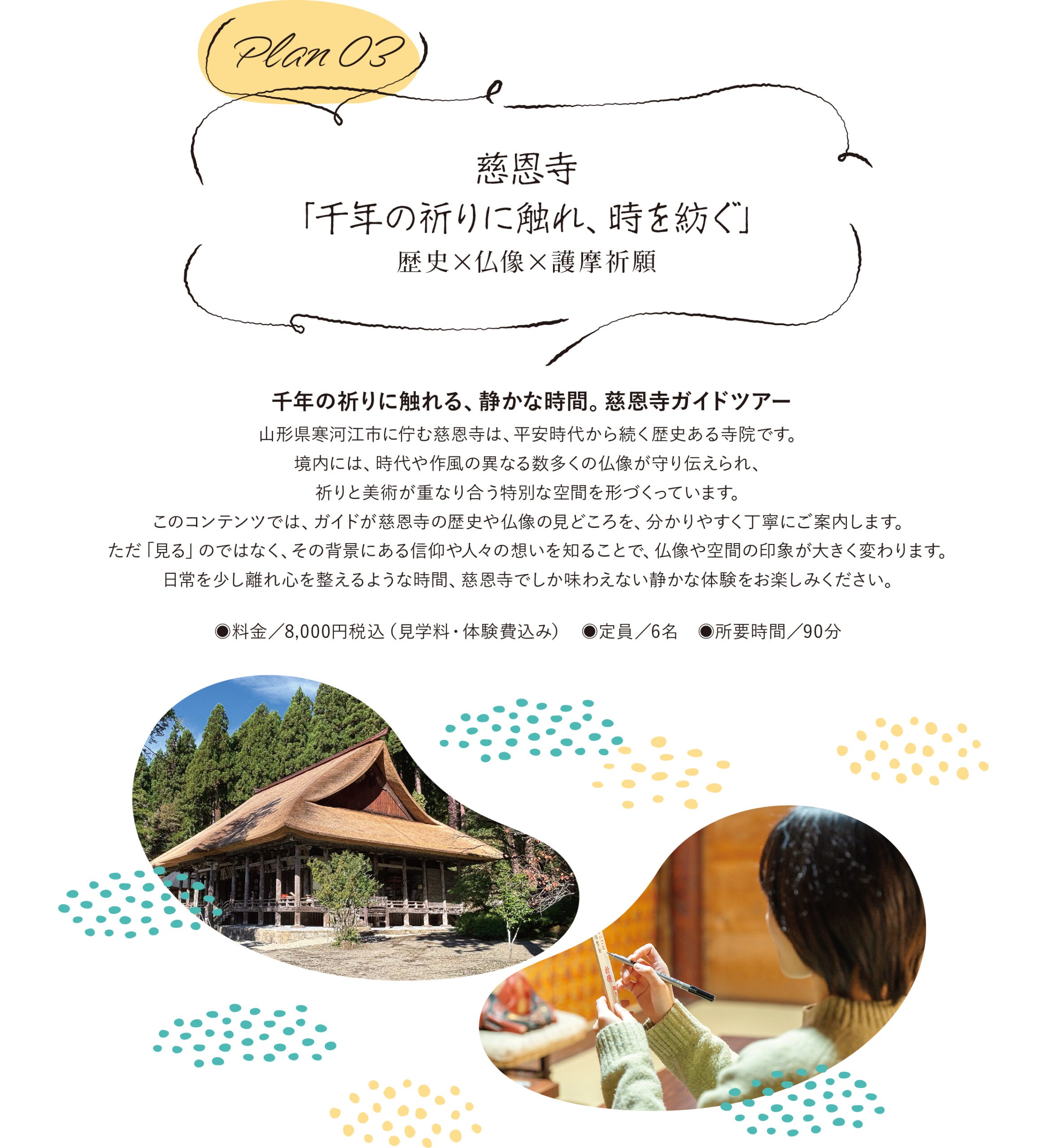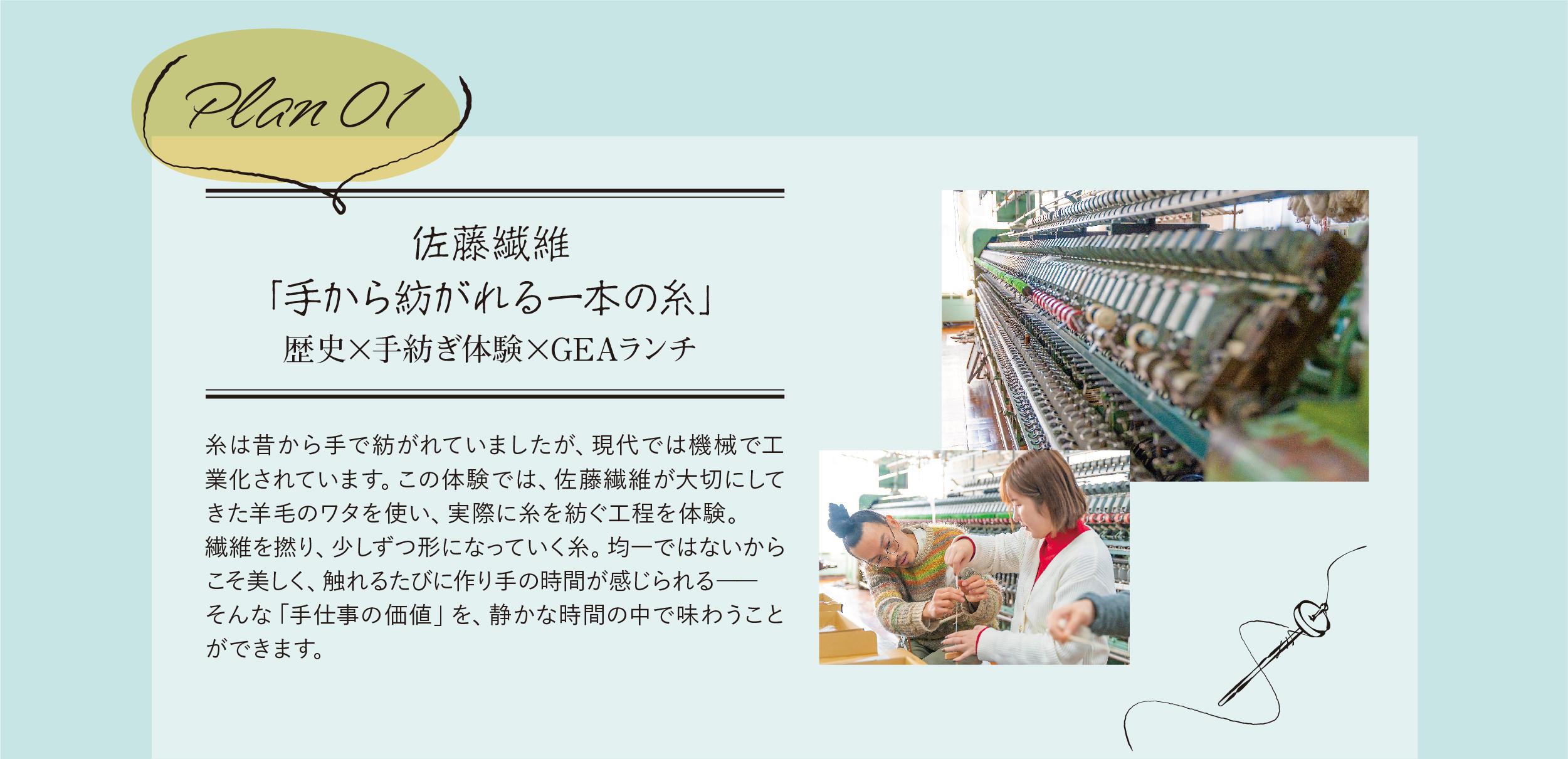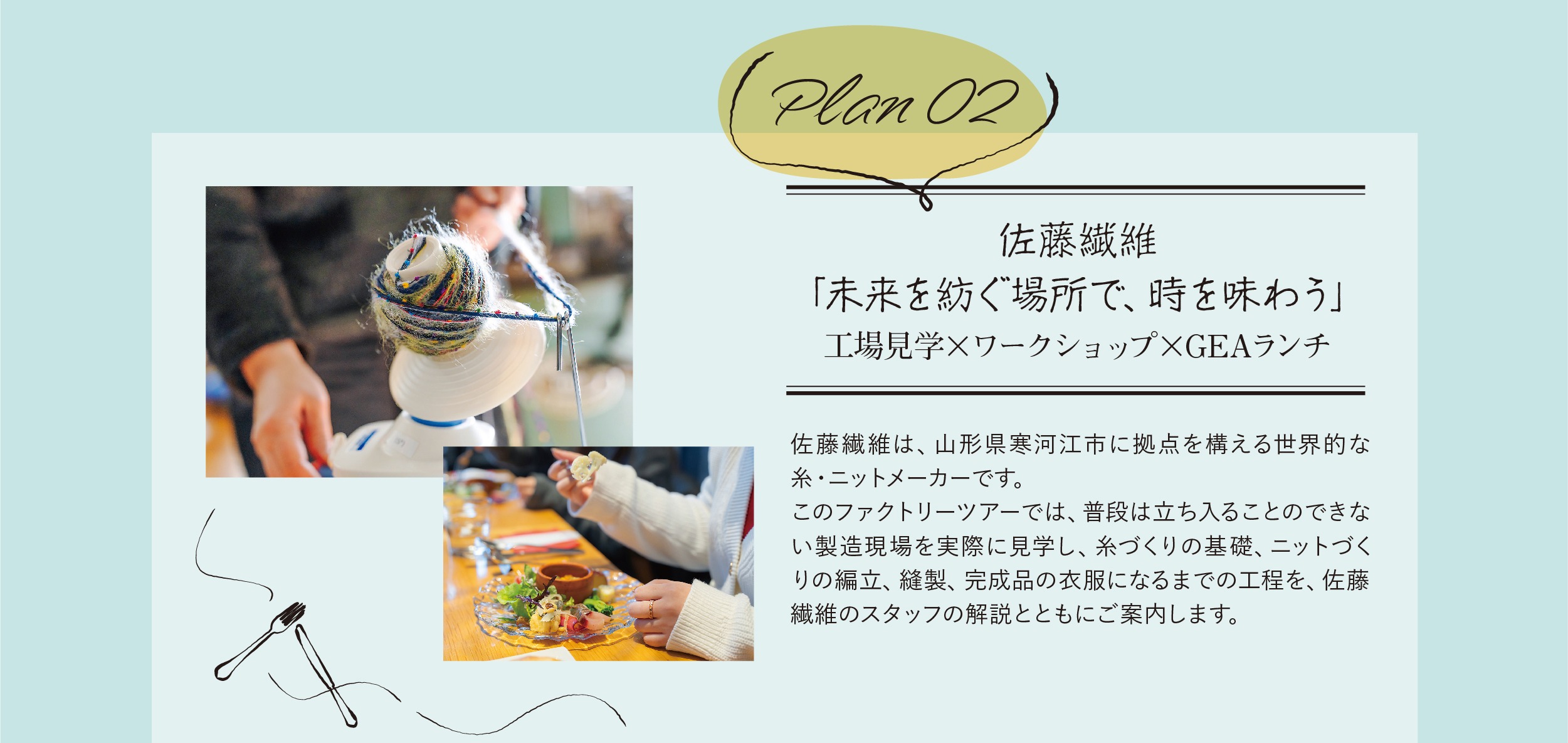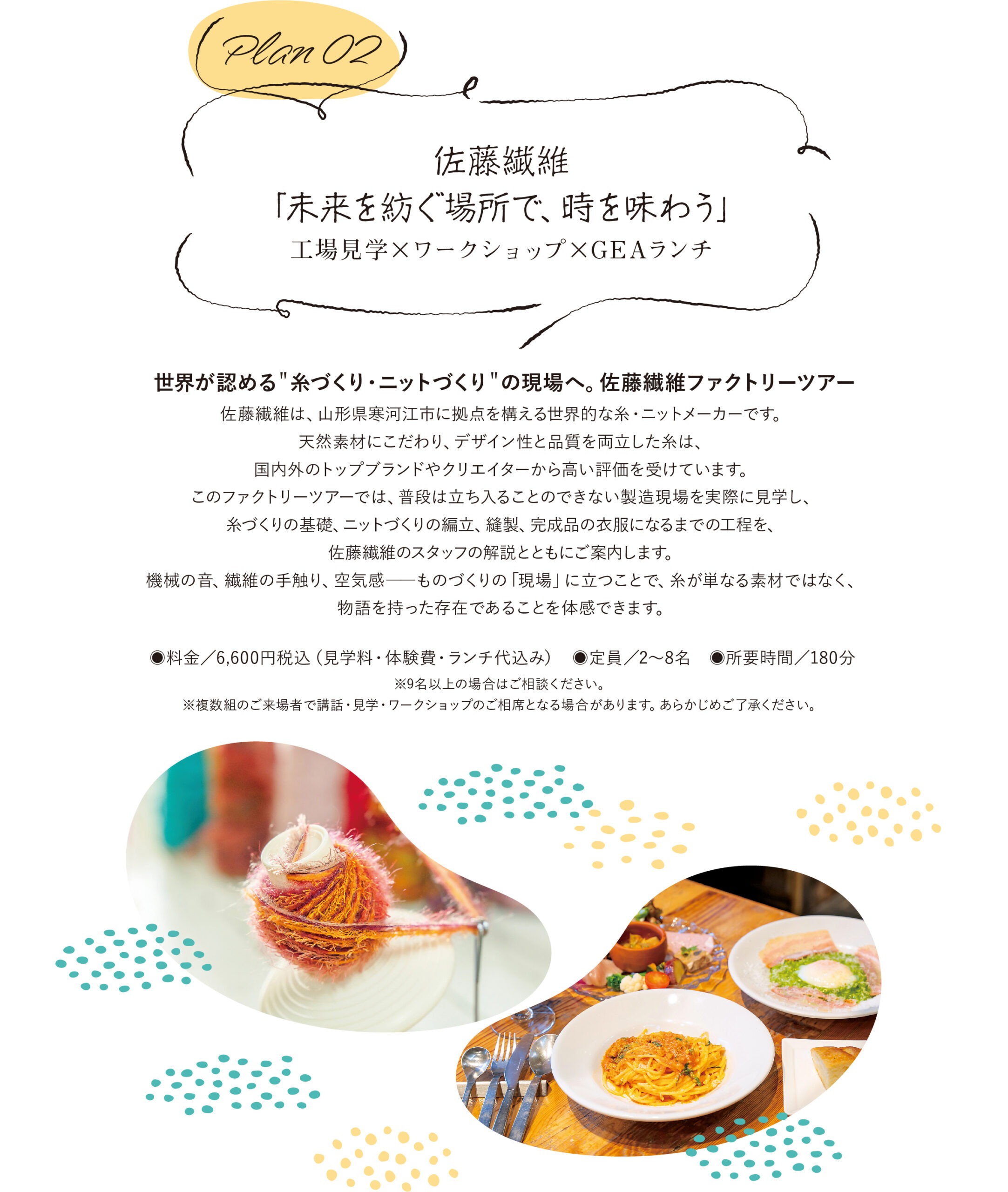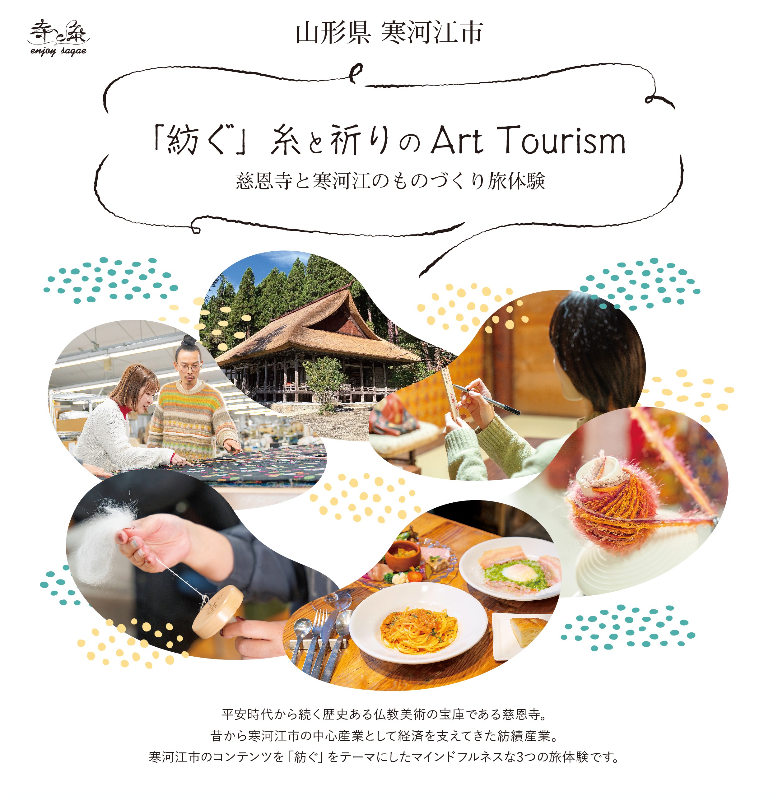 「紡ぐ」糸と祈りの Art Tourism 〜 慈恩寺と寒河江のものづくり旅体験 〜 ホーム〉「紡ぐ」糸と祈りの Art Tourism 〜慈恩寺と寒河江のものづくり旅体験〜 詳しくはこちら 詳しくはこちら 詳しくはこちら 佐藤繊維 https://satoseni.com/GEA https://www.gea.yamagata.jp/ ご予約はこちら 佐藤繊維 https://satoseni.com/GEA https://www.gea.yamagata.jp/ ご予約はこちら 本山慈恩寺 https://honzan-jionji.jp/ ご予約はこちら