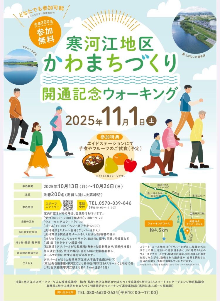 11/1(土) 「かわまちづくり開通記念ウォーキング」 2025年11月1日(土)、山形県寒河江市にて「寒河江地区 かわまちづくり 開通記念ウォーキング」が開催されます。新しく整備された最上川沿いの遊歩道を約1時間30分かけて歩くウィーキングイベントです! 参加費は無料で、なんと先着200名様をご招待!秋の心地よい風を感じながら、新しくできた最上川沿いの遊歩道を歩き、美しい川の景色と自然を満喫できます。 ◆開催期間:2025年 11月1日(土) 9:30スタート(受付 8:30~)◆開催場所:グリバーさがえ◆参加費 :無料◆お問合せ:TEL 080-6620-2634(平日10:00~17:00) 2025年10月29日更新